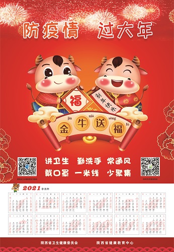 2021年春节临近,按照省卫生健康委新冠疫情常态化防控健康教育工作要求,进一步做好新冠疫情常态化防控健康宣教,陕西省健康教育中心设计、制作了疫情常态化防控宣传年画2万张,下发至各地市,供基层张贴宣传使用。本次印制的宣传年画以漫画搭配简短标语的形式呈现,以“防疫情,过大年”为主题,在金牛送福的喜庆年画上,印有“讲卫生、勤洗手、常通风、戴口罩、一米线、少聚集”的健康知识宣传语。宣传年画将通过各市、县区健康教育机构,陆续发放到居民手中。